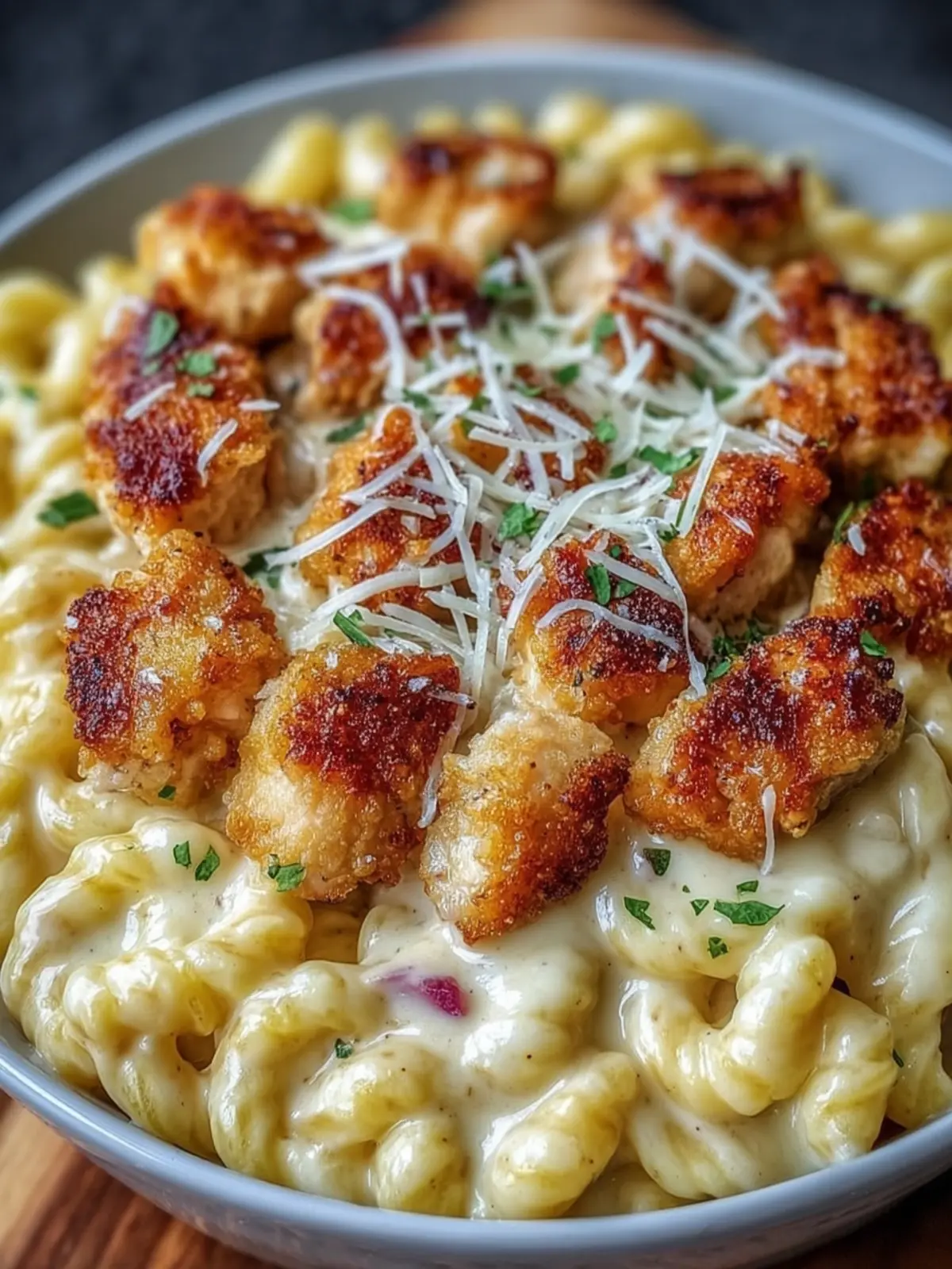 Feel free to enjoy your Crispy Chicken Alfredo Pasta with a sprinkle of chopped parsley or fresh basil for a burst of color and freshness!