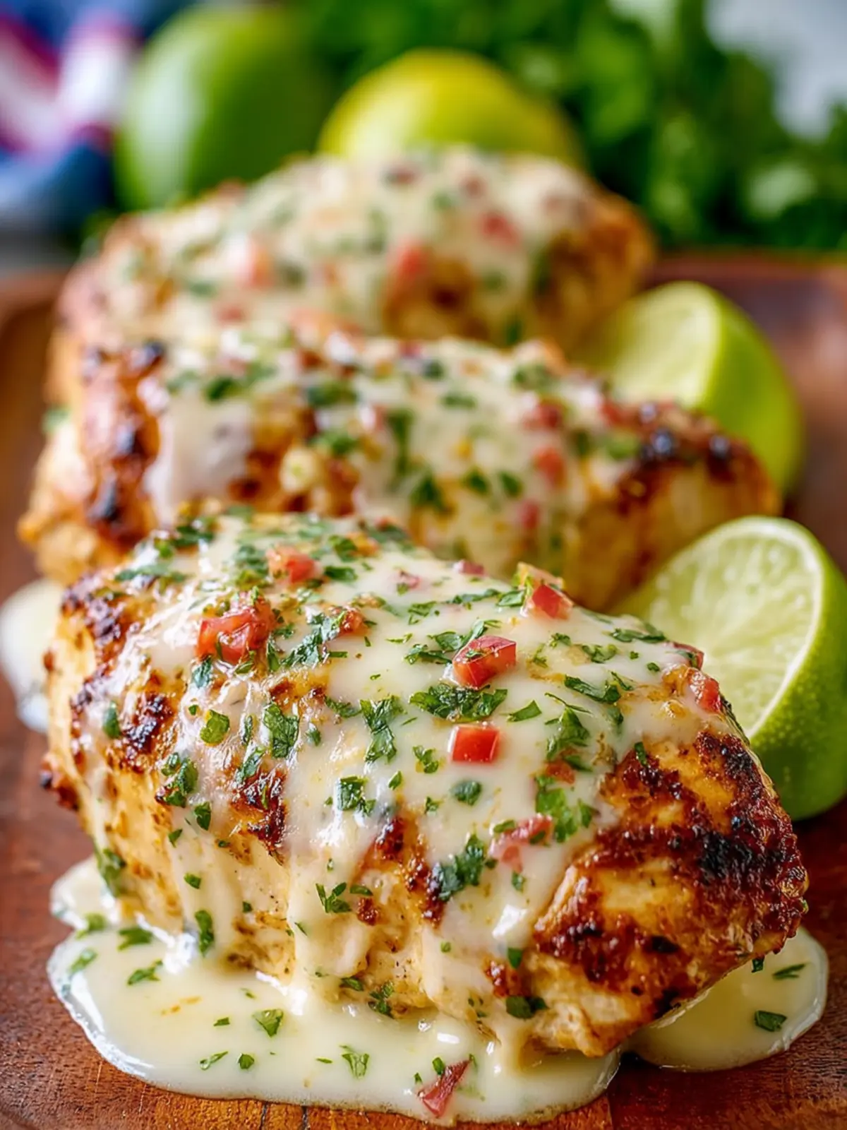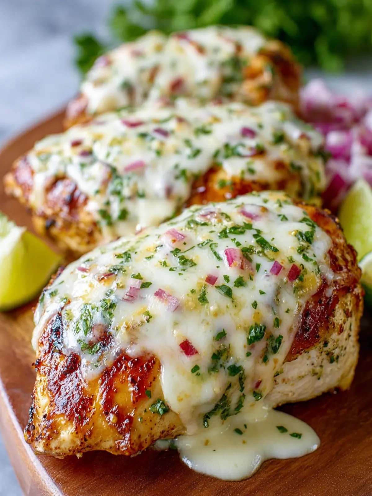 Delicious grilled chicken breasts marinated in salsa verde and spices, topped with Pepper Jack cheese.