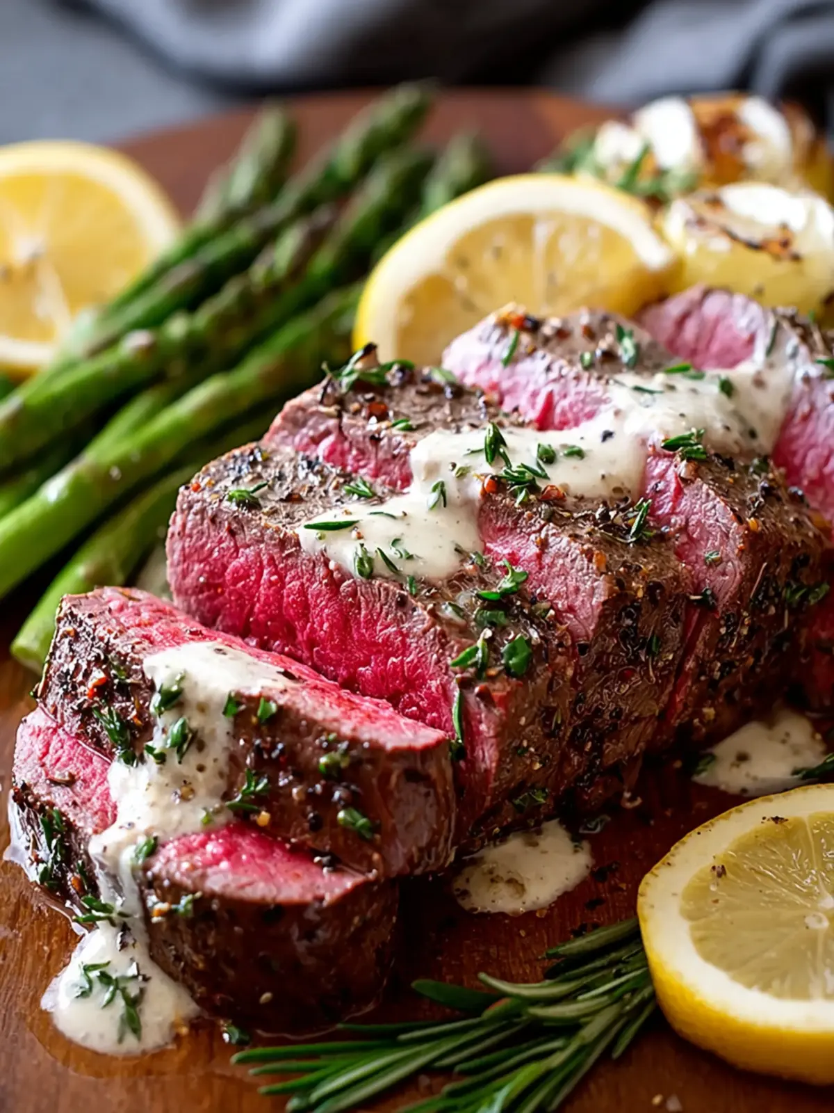 Juicy and flavorful roasted beef tenderloin served with a creamy garlic sauce.