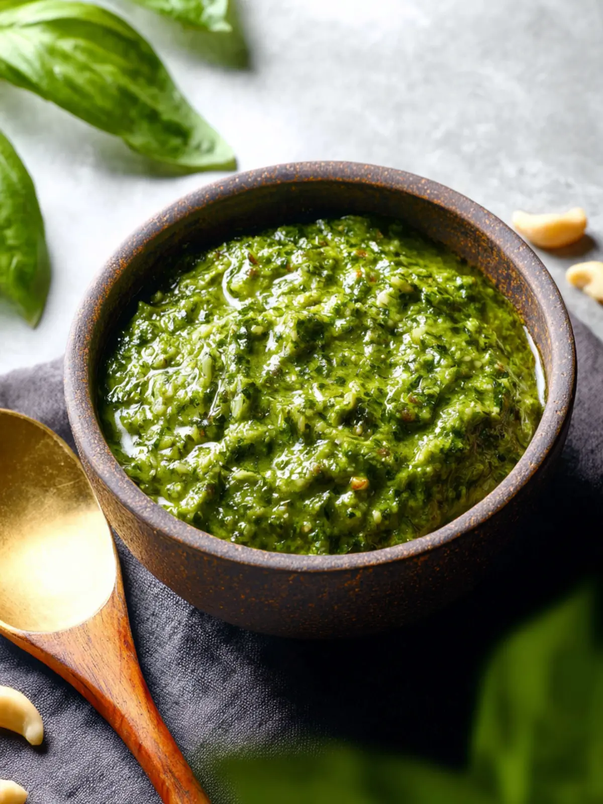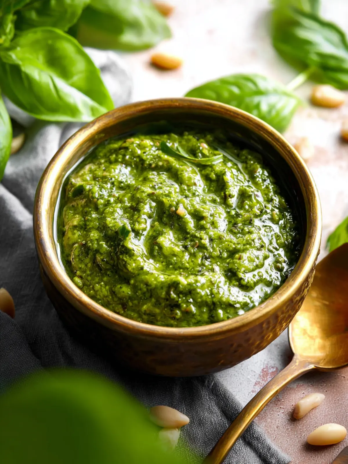 A fresh and flavorful homemade pesto sauce made with garlic, basil, and Parmesan.