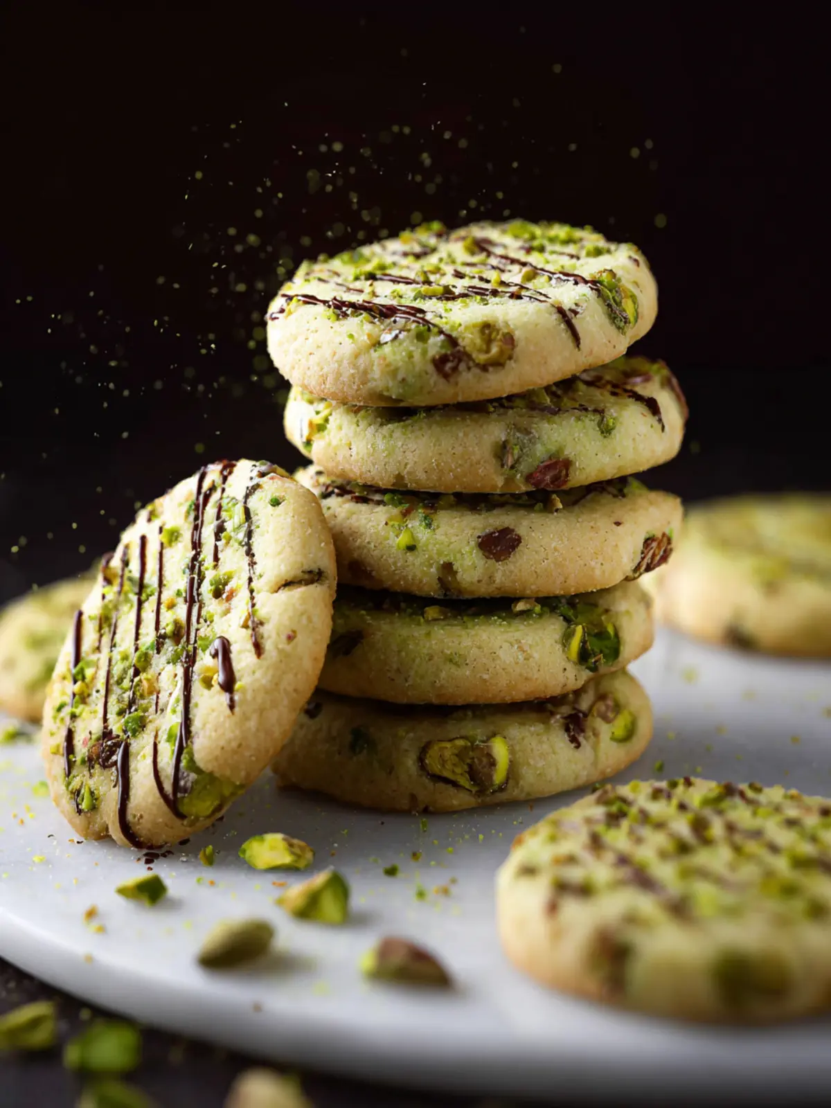 Deliciously soft pistachio cookies drizzled with chocolate.