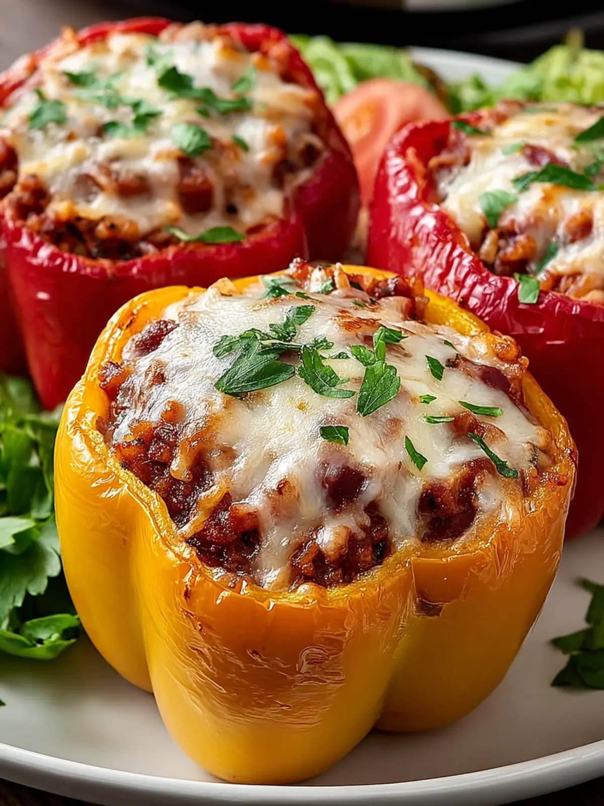 Delicious stuffed bell peppers filled with ground meat, rice, tomatoes, and cheese, perfect for a hearty meal.