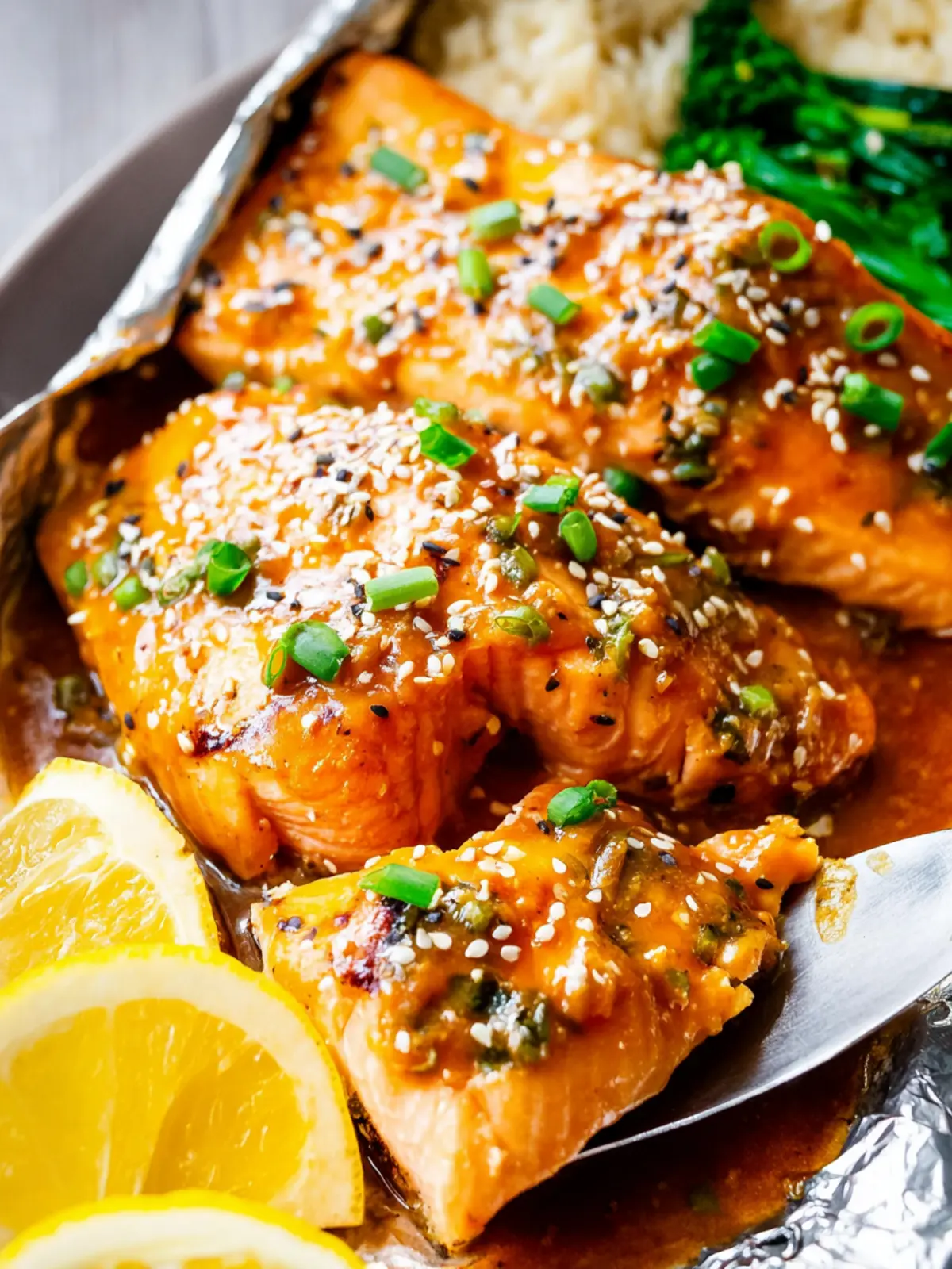 - In a small bowl mix together the honey, soy sauce, sesame oil, ginger, and garlic. Pour the glaze over the salmon and wrap the aluminum foil loosely around the salmon.
