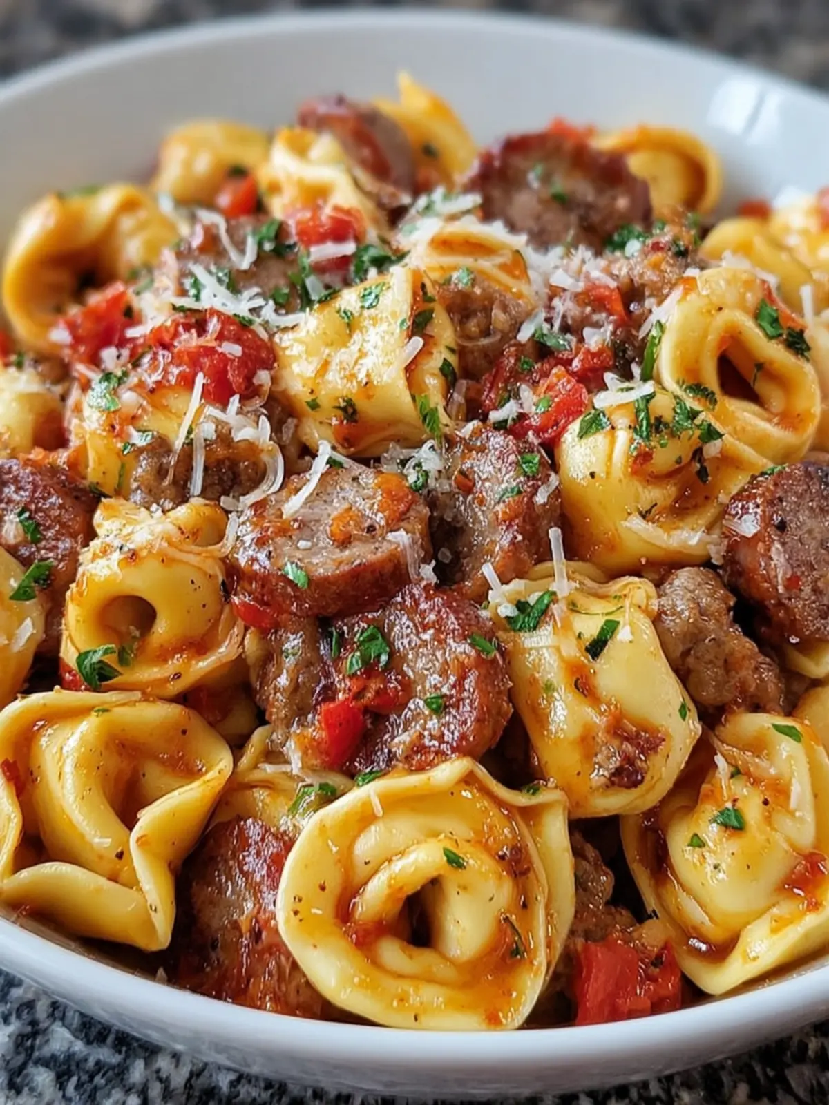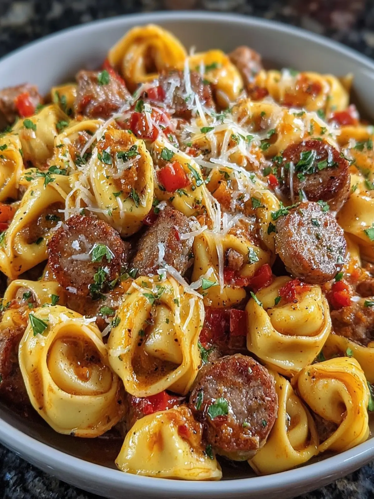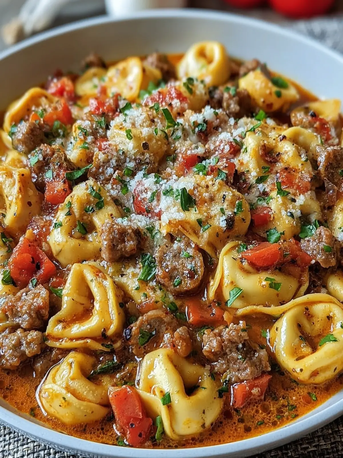- Combine Ingredients: Add the cooked sausage back into the skillet, then add the cooked tortellini. Stir in the Parmesan cheese and season with salt, pepper, and red pepper flakes if using.